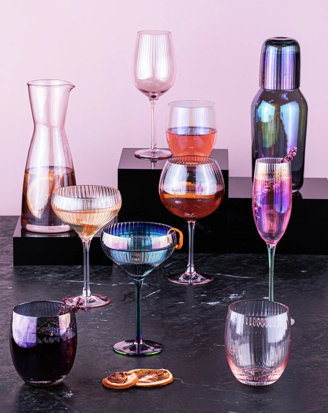 Elevate your table with Thalia collection. Its ribbed design, opalescent electroplated finish, and lead-free crystal make it a timeless centerpiece. Reflecting beautifully in light, these exquisite pieces add opulence to any dinner party.