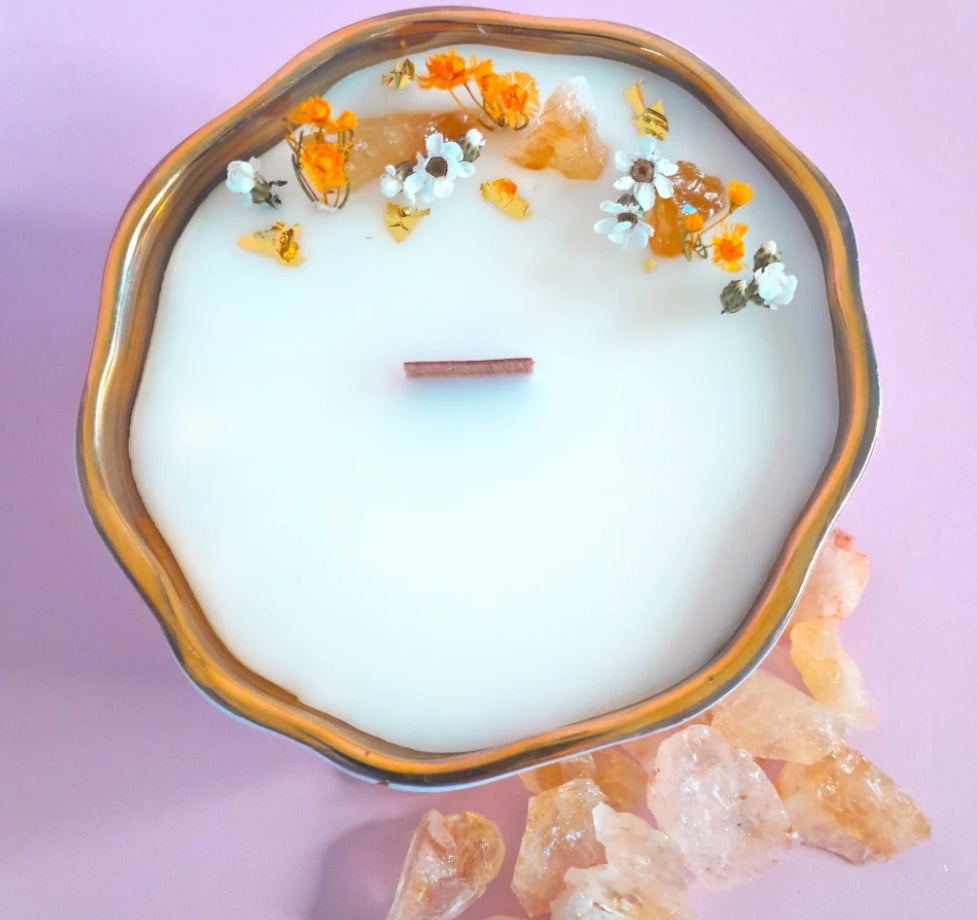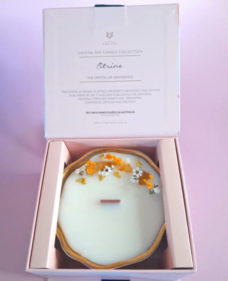 Little Pink Fox luxury hand poured soy crystal candles are the ultimate in gift giving. Infused with the most divine fragrance, sprinkled with gold leaf, dried flowers and carefully placed healing crystals. Packaged securely in their very own luxurious gift box and tied with a black satin bow, these stunning candles are sure to impress. 40 hrs burn time.