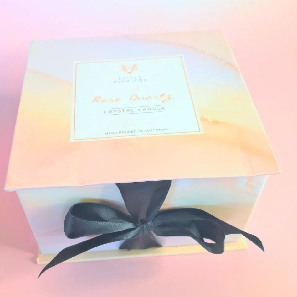 Little Pink Fox luxury hand poured soy crystal candles are the ultimate in gift giving. Infused with the most divine fragrance, sprinkled with gold leaf, dried flowers and carefully placed healing crystals. Packaged securely in their very own luxurious gift box. These stunning candles are sure to impress. 40 hrs burn time.