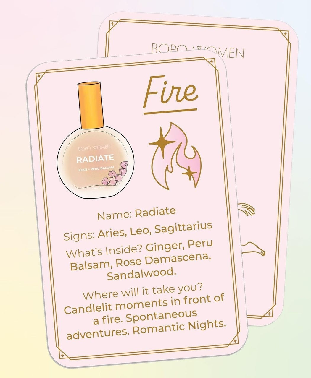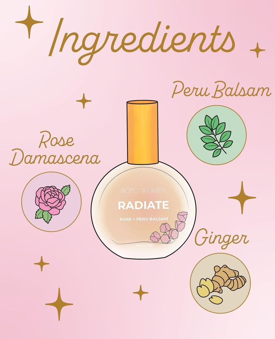 Let sparks fly and indulge in the sweet and spicy scent of Radiate. Starring passionate florals, delicate rose damascena adds sweet pink notes with long-lasting depth, while fruity and flowery ylang-ylang softens the balsamic woodiness of sandalwood. Peppery sharp ginger adds a warm fiery element and smoky Peru balsam a touch of vanilla, wood and cinnamon. Intense and soft, this versatile day or night scent will transport you to candlelit moments in front of an open fire, spontaneous adventures and romantic nights.