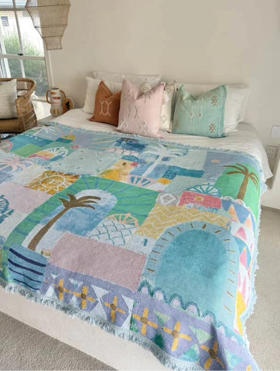 Rock the Kasbah Throw featuring Sunset pinks, ocean blues and desert golds, each pattern tells a tale of the Kasbah. The arches of ancient doorways, silhouettes of palm trees swaying in the breeze, bustling souks with their endless treasures and steaming pots of mint tea. This throw has the magic power to transport you into the stories woven within.