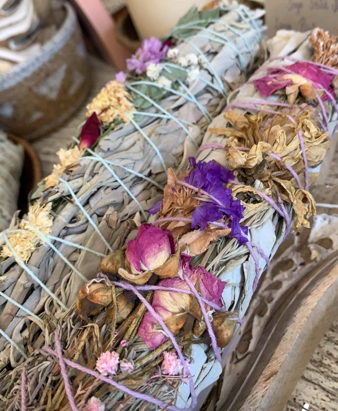 Cleanse your space with our divine hand made sage, rose, rosemary and lavender smudge sticks.