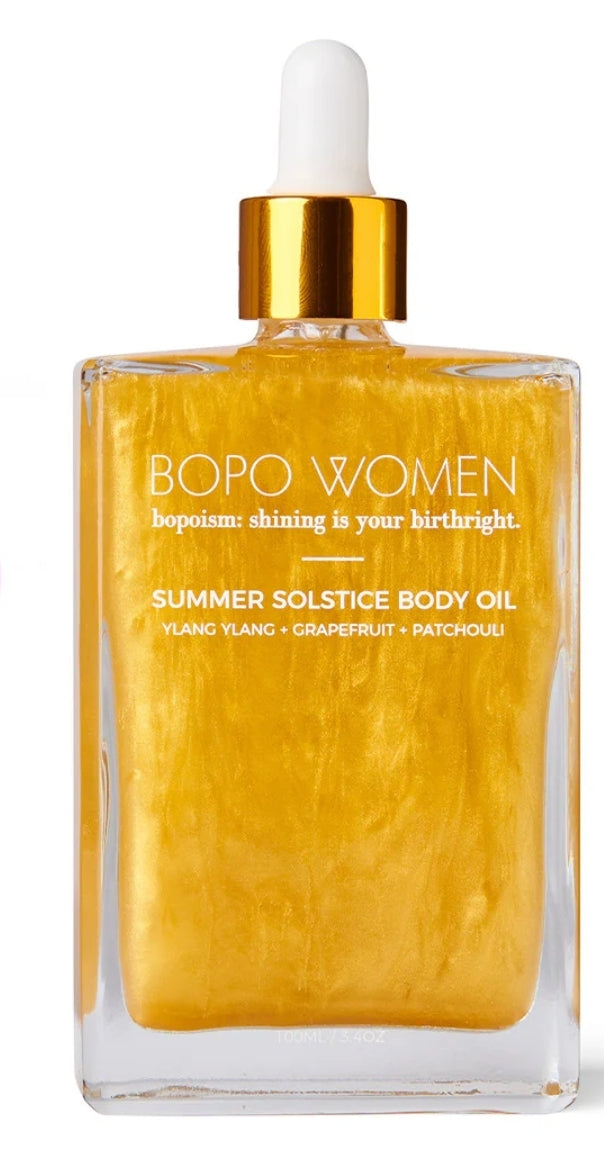 Bopo Summer Solstice Body Oil is an all natural shimmer oil with a delicate floral perfume thanks to the beautiful Ylang Ylang, Grapefruit, Mandarin & Sweet Orange. Deeply hydrates skin while leaving a light sun-kissed glow and works well with all skin types. Can also be used in the bath. Make sure to regularly shake this product before use to get the most out of it's glittery magic. P.s. If you like our Aphrodite perfume roller you'll love this oil as it's the same scent!